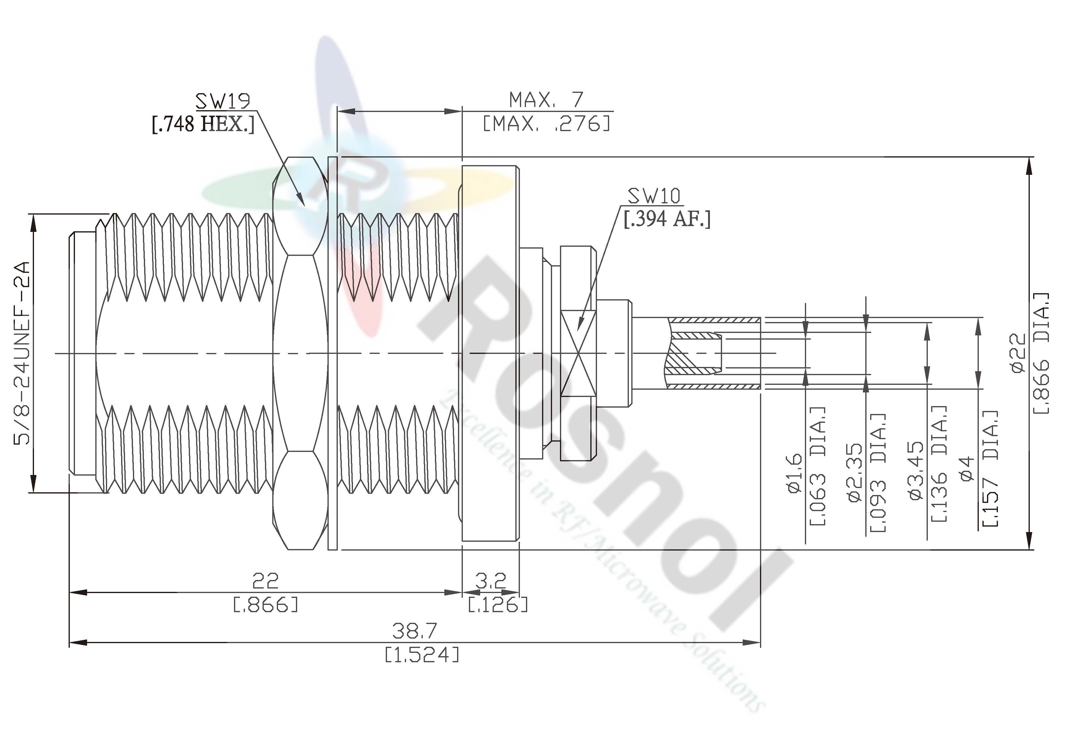 Rosnol's N2CA50-D316A/H4 bulkhead female N RF connector has a maximum frequency of 11 GHz and a max. VSWR of 1.15 or min. Return Loss of 23.1 dB. As a result, this high-quality bulkhead connector is a good alternative to the interconnect product choices from competitors from Europe, the USA, or other markets.
