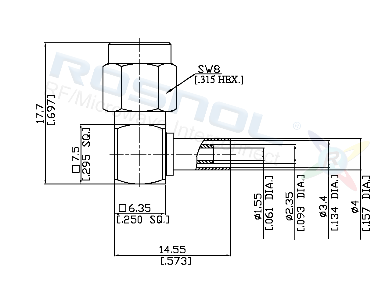 Rosnol's SMA1C59-D316A/11X right angle male SMA RF connector has a maximum frequency of 12.4 GHz and a max. VSWR of 1.20 or min at 2.5 to 5 GHz. Return Loss of 20.83 dB. As a result, this high-quality cable connector is a good alternative to the interconnect product choices from competitors from Europe, the USA, or other markets.
