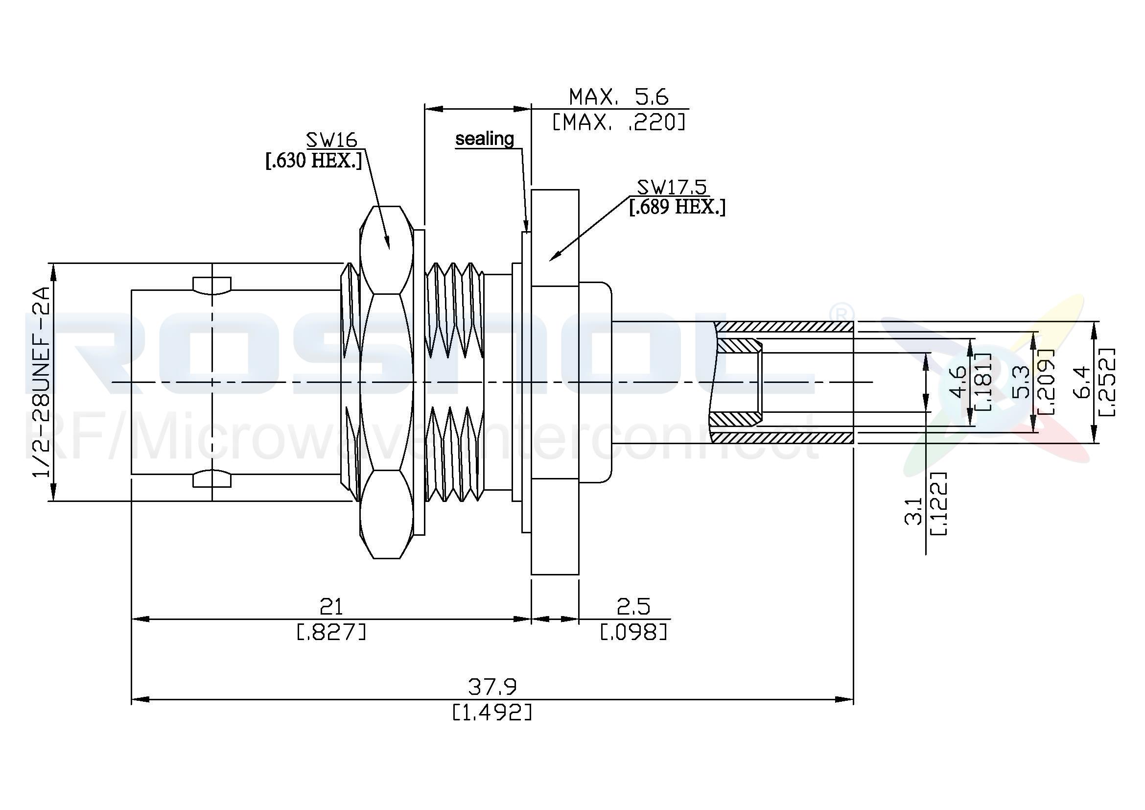 Rosnol's BNC2CA50-G058B/H3 bulkhead female BNC RF connector has a maximum frequency of 4 GHz and a max. VSWR of 1.20 or min. Return Loss of 20.1 dB. As a result, this high-quality bulkhead connector is a good alternative to the interconnect product choices from competitors from Europe, the USA, or other markets.