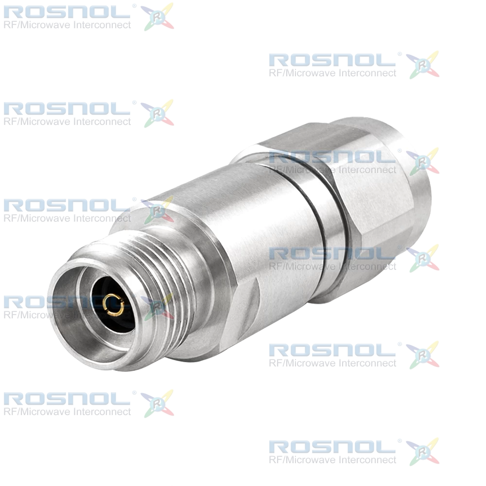 The ROSNOL DB-K1K25A-40G50V/9XX-9X is a high-frequency DC Block connector featuring a 2.92mm plug (male) to 2.92mm jack (female) interface. Designed for precision RF applications, it operates from 70 MHz to 40 GHz with a nominal impedance of 50 Ω and supports a DC voltage rating of 50V. The connector ensures excellent signal integrity with a VSWR of ≤ 1.15 (≥ 23.13 dB) and insertion loss of ≤ 0.8 dB. Its inner DC block configuration enhances isolation performance, while the screw-lock coupling mechanism ensures secure and stable mating.This connector is constructed using premium materials: beryllium copper center contacts with 3 µinch gold plating over 80 µinch non-magnetic nickel-phosphorus underplating; passivated stainless steel body and coupling nut; PEI insulators. It operates reliably across a temperature range of -40°C to +85°C and is fully RoHS compliant.