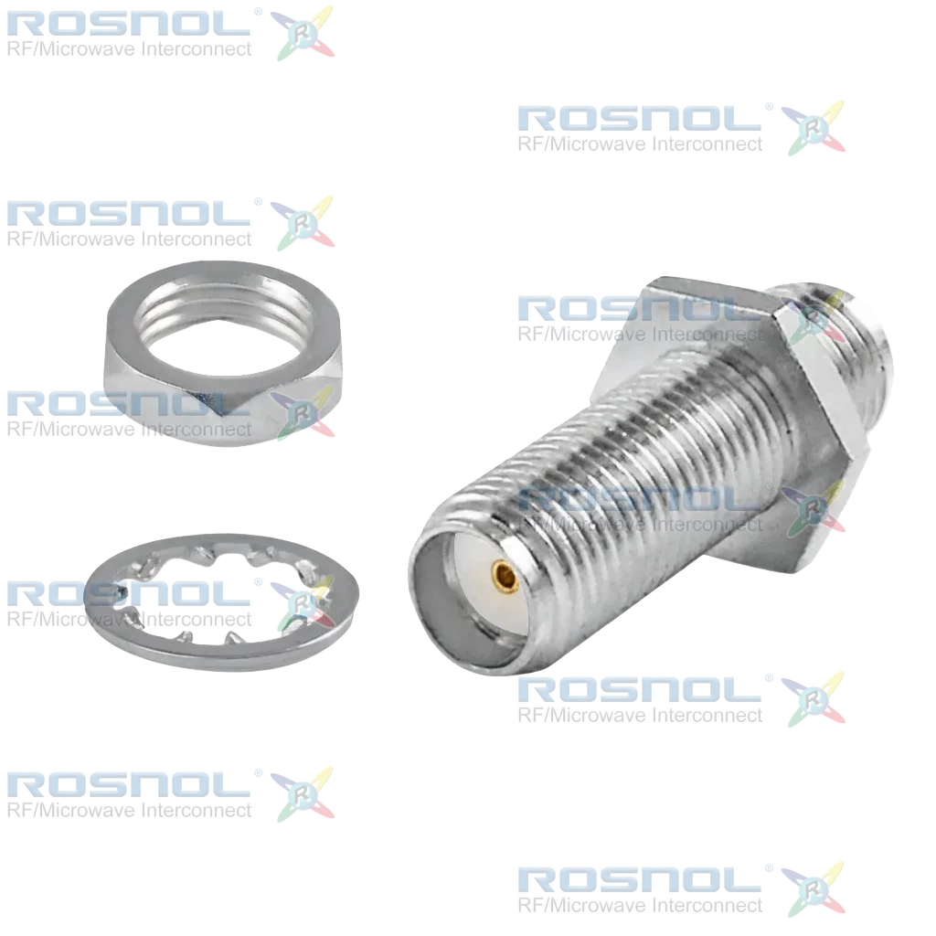 The ROSNOL AD-A2A25D-BH/9X-9X is a bulkhead SMA jack-to-jack adapter designed for DC to 18 GHz operation at 50 Ω impedance. It delivers VSWR ≤ 1.20 (Return Loss ≥ 20.8 dB), insertion loss ≤ 0.05 × √f (GHz), insulation resistance ≥ 5 GΩ, test voltage 1000 V rms, working voltage 480 V rms, and power handling up to 200 W at 2 GHz. The screw-lock coupling ensures axial center-contact captivation ≥ 27 N, radial captivation ≥ 3 N·cm, and mechanical durability of at least 500 mating cycles, with recommended torque between 0.8 and 1.1 Nm.Materials and plating include beryllium copper center contacts with gold plating over non-magnetic nickel-phosphorus underplating; stainless steel body and fastening nut, passivated; PTFE insulator; washer in brass with copper-tin-zinc alloy finish. The assembly supports a temperature range from −65 °C to +155 °C and offers excellent corrosion resistance.