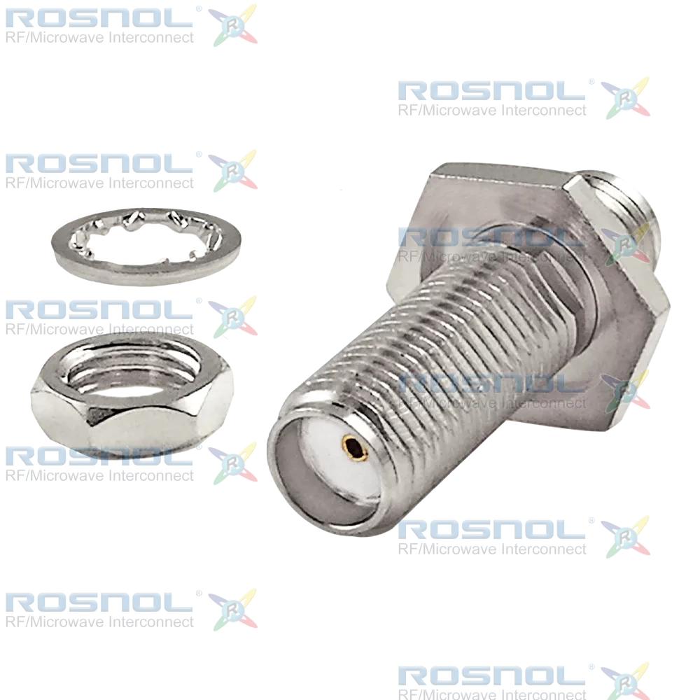 The ROSNOL AD-A2A25E-BH/9X-9X is a bulkhead SMA jack-to-jack adapter designed for DC to 18 GHz operation at 50 Ω impedance. It delivers VSWR ≤ 1.20 (Return Loss ≥ 20.8 dB), insertion loss ≤ 0.05 × √f (GHz), insulation resistance ≥ 5 GΩ, center contact resistance ≤ 3 mΩ, outer contact resistance ≤ 2 mΩ, test voltage 1000 V rms, working voltage 480 V rms, and power handling up to 200 W at 2 GHz. RF leakage is rated at ≥ 100 dB up to 1 GHz. The screw-lock coupling mechanism ensures axial contact captivation ≥ 27 N, radial captivation ≥ 3 N·cm, and mechanical durability of at least 500 mating cycles, with recommended torque between 0.8 and 1.1 Nm.Materials and plating include beryllium copper center contacts with gold plating over non-magnetic nickel-phosphorus underplating; stainless steel body and fastening nut, passivated; PTFE insulator; washer in brass with copper-tin-zinc alloy finish. The assembly supports a temperature range from −65 °C to +155 °C and offers excellent corrosion resistance.