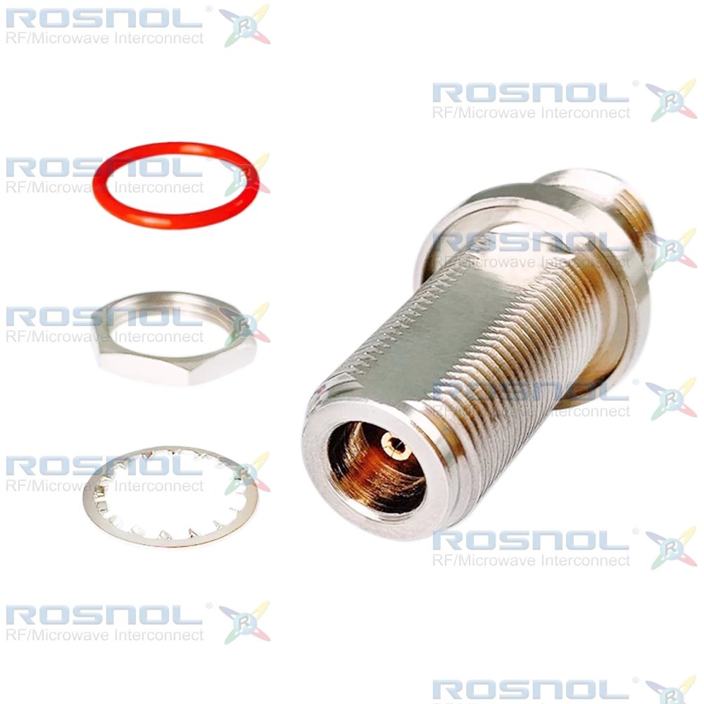 The ROSNOL AD-PCN2PCN25A-BH/94-94 is a precision bulkhead adapter designed for 50 Ω systems operating from DC to 18 GHz. It achieves VSWR ≤ 1.30, insertion loss ≤ 0.05 × √f (GHz) dB, insulation resistance ≥ 5 GΩ, and RF leakage ≥ 90 dB up to 1 GHz. Rated for a working voltage of 1000 V rms and a test voltage of 2500 V rms, this adapter ensures secure connectivity with a screw-lock coupling mechanism. Mechanical durability includes ≥ 500 mating cycles, axial captivation ≥ 28 N, and recommended torque between 0.70 and 1.0 Nm.Materials and plating: center contacts are beryllium copper with gold plating (3 µinch) over a non-magnetic nickel-phosphorus underplate (80 µinch). The body, fastening nut, and washer are brass with copper-tin-zinc alloy plating for corrosion resistance, while the insulator is PS for excellent dielectric stability. A silicone rubber gasket provides environmental sealing. Operating temperature range is −65°C to +165°C.