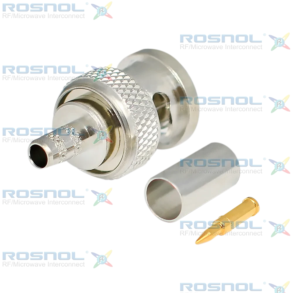 The ROSNOL BNC1C50-G058A/133 is a straight BNC plug (male) connector designed for RG58 and compatible coaxial cables such as RG58A, RG58C, RG141, RG303, BELDEN 7806A, BELDEN 9907, and LMR195. Operating from DC to 4 GHz with a 50 Ohm impedance and VSWR ≤ 1.22, this bayonet-lock connector ensures low insertion loss ≤ 0.05 dB and stable RF signal transmission, making it ideal for telecom, broadcast, and instrumentation applications.This model features a brass body and coupling nut plated with nickel. The center contact is made of brass with gold plating over nickel underplating, ensuring excellent conductivity and corrosion resistance. It includes a PTFE insulator and silicone rubber gasket, and supports soldered or crimped center contact with crimped cable entry. Designed for wide temperature ranges and over 500 mating cycles, it delivers consistent performance in demanding environments.