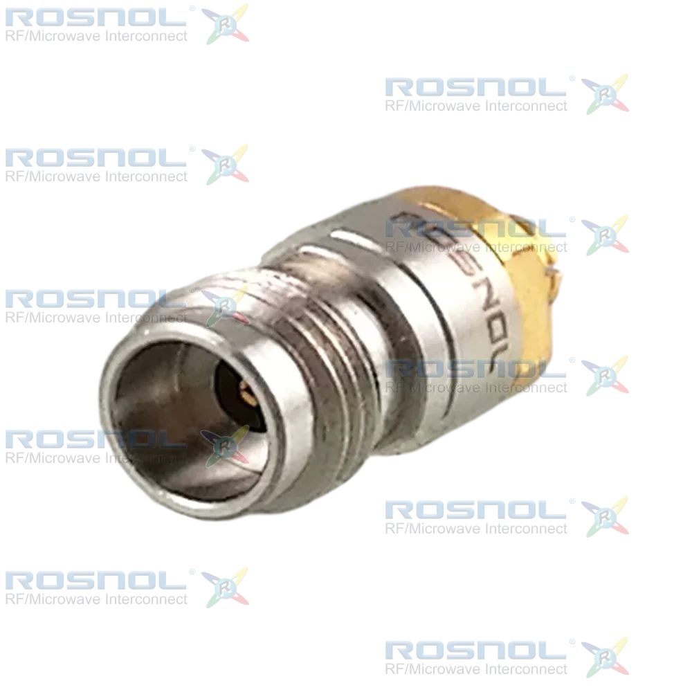 The ROSNOL AD-Q2P25A/9X-99 is engineered for DC to 40 GHz applications, offering 50 Ω impedance, VSWR ≤ 1.20 (≥20.83 dB return loss), and insertion loss ≤ 0.05√f (GHz) dB. Electrical specifications include insulation resistance ≥5 GΩ and robust contact integrity. Coupling mechanisms include screw-lock for the 2.4mm side and snap-on for the SMP side, ensuring secure engagement and mechanical endurance suitable for high-frequency systems.Material construction includes beryllium copper center contacts with gold plating over nickel underplating, stainless steel bodies with passivation for the 2.4mm interface, and beryllium copper body for SMP with gold plating. PS insulators provide stable dielectric properties. The adapter withstands temperatures from −60°C to +100°C, ensuring dependable performance in harsh conditions.