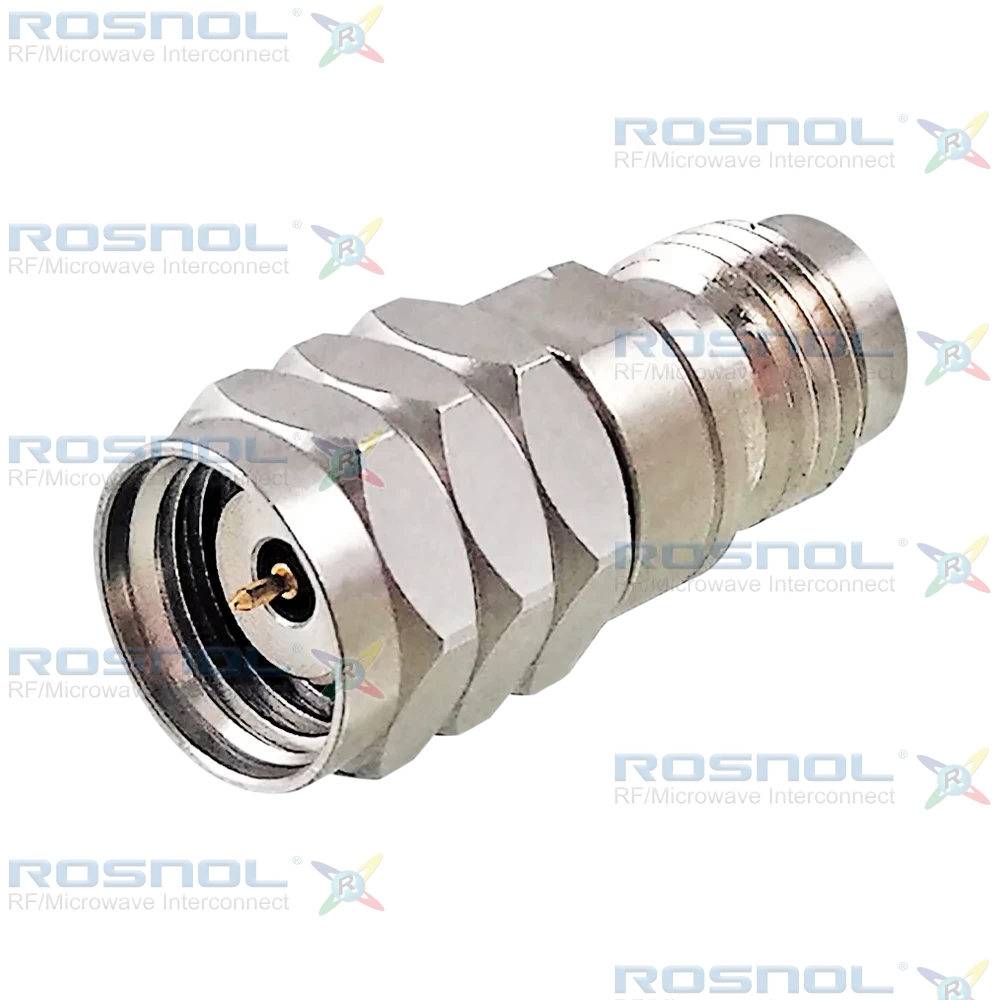 The ROSNOL AD-V1Q25A/9XX-9X is a high-performance 50-ohm straight adapter optimized for DC to 50 GHz, achieving VSWR ≤ 1.20 (≥ 20.8 dB return loss) with insertion loss ≤ 0.05 × √F (GHz) dB. It offers robust electrical characteristics including insulation resistance ≥ 5 GΩ, and secure mechanical engagement via screw-lock coupling on both sides. Center-contact captivation is ≥ 20 N and mechanical endurance is rated at ≥ 500 mating cycles, with recommended torque of 0.80–1.10 Nm and side test torque of 1.65 Nm.Materials and plating are engineered for reliability: beryllium copper center contacts with 3 microinch gold plating over an 80 microinch non-magnetic nickel-phosphorus underplating deliver excellent conductivity and wear resistance. Stainless steel bodies and coupling nuts are passivated to enhance corrosion protection, while PEI insulators ensure stable dielectric behavior. The adapter maintains performance across −60°C to +100°C.
