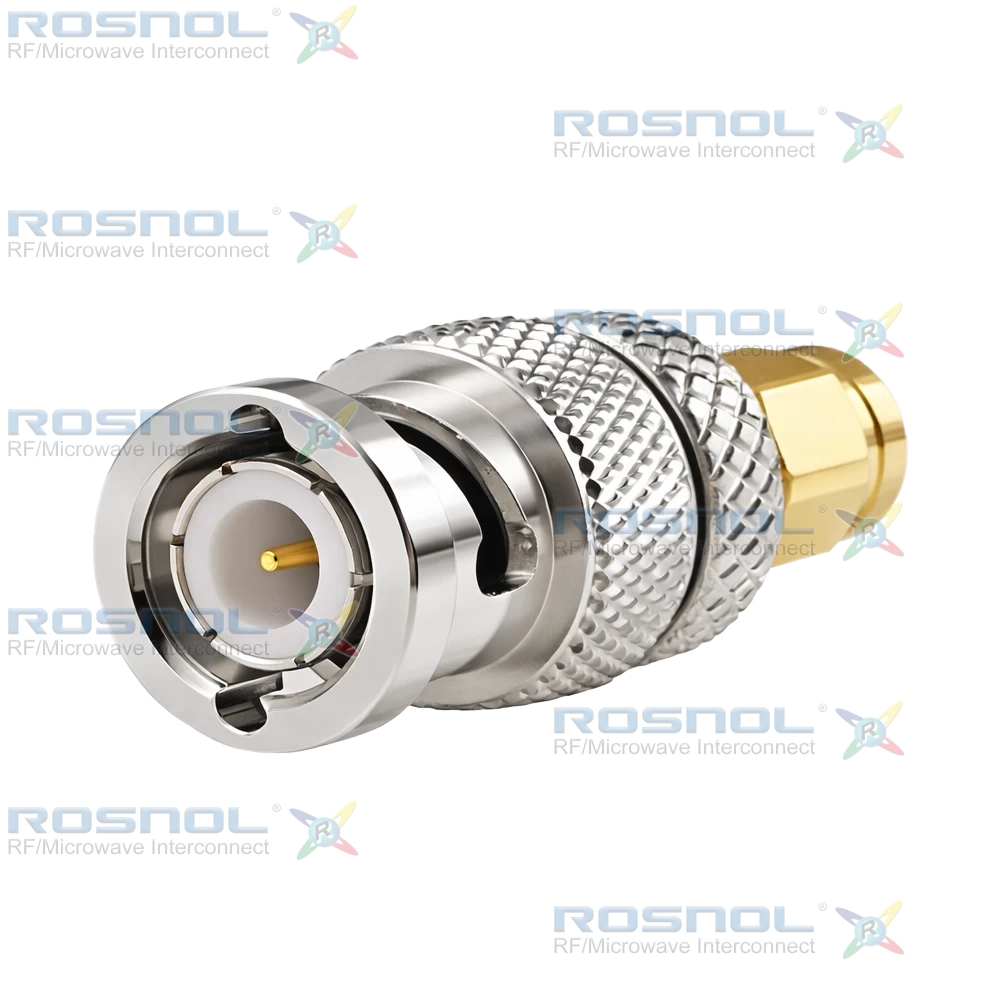 The ROSNOL AD-A1B15A/111-133 is a high-performance RF adapter designed for SMA to BNC interconnects, supporting DC to 6 GHz. It features 50 Ω impedance, VSWR ≤1.15 (≥23.13 dB) up to 4 GHz and ≤1.2 (≥20.83 dB) from 4–6 GHz, and insertion loss ≤0.05 × √F (GHz) dB. RF leakage is rated ≤80 W @ 2 GHz. Mechanical specifications include screw-lock coupling on the SMA side and bayonet-lock on the BNC side, ≥500 mating cycles, axial captivation ≥27 N, and torque range of 0.8–1.1 Nm.Constructed with a gold-plated brass SMA interface and nickel-plated brass BNC interface, the adapter features brass center contacts with 3 µinch gold plating over 80 µinch non-magnetic nickel-phosphorus underplating. PTFE insulators and silicone rubber gaskets ensure robust dielectric and sealing performance.