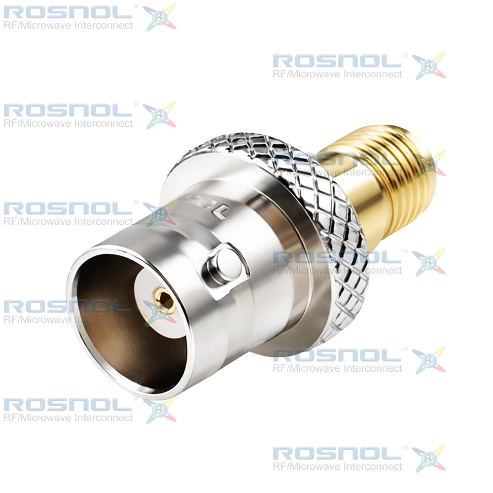 The ROSNOL AD-A2B25A/91-93 RF adapter combines SMA jack (female) and BNC jack (female) interfaces for versatile connectivity in RF systems. Operating from DC to 6 GHz with 50-ohm impedance, it achieves VSWR ≤ 1.15 up to 4 GHz and ≤ 1.2 up to 6 GHz, insertion loss ≤ 0.05 × √F (GHz) dB, and insulation resistance ≥ 5 GΩ. RF leakage performance supports up to 80 W at 2 GHz. Mechanical features include screw-lock coupling on the SMA side and bayonet-lock on the BNC side, with mating cycles of 500 minimum and torque range of 0.8–1.1 Nm for SMA.Constructed for durability, the center contacts are beryllium copper with gold plating over a nickel-phosphorus underlayer. The SMA body is brass with gold plating, while the BNC body uses brass with nickel finish. PTFE insulators provide excellent dielectric properties, ensuring stable performance under demanding conditions.
