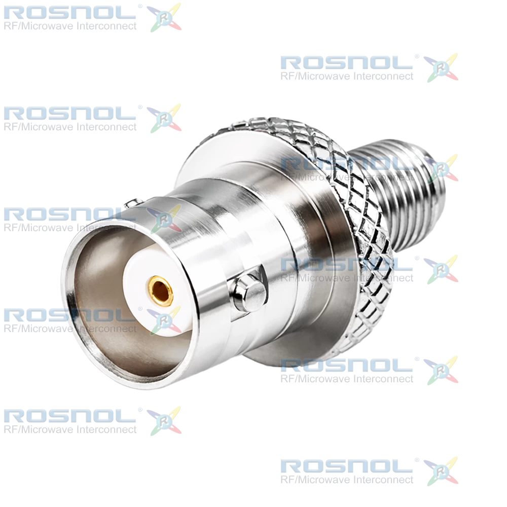 The ROSNOL AD-A2B25A/94-94 RF adapter connects SMA jack (female) to BNC jack (female), supporting DC to 6 GHz operation with 50-ohm impedance. Electrical performance includes VSWR ≤ 1.15 up to 4 GHz and ≤ 1.2 up to 6 GHz, insertion loss ≤ 0.04 × √F (GHz) dB, and insulation resistance ≥ 5 GΩ. RF leakage supports up to 80 W at 2 GHz. Mechanical design features screw-lock coupling for SMA and bayonet-lock for BNC, with mating cycles of 500 minimum and torque range of 0.8–1.1 Nm for SMA.Premium materials ensure reliability: beryllium copper center contacts with gold plating over nickel-phosphorus underlayer, brass bodies with copper-tin-zinc alloy plating, and PTFE insulators for superior dielectric performance.