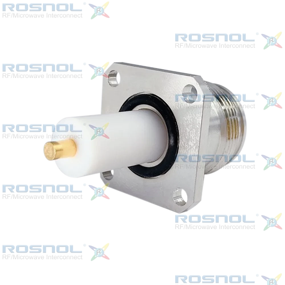 The ROSNOL 43102GFA50-4380A/H4 is engineered for high-frequency RF systems requiring robust panel mounting. Rated for DC to 6 GHz, it offers 50 Ω impedance, VSWR ≤ 1.20, insertion loss ≤ 0.1√f (GHz) dB, and RF leakage ≥ 110 dB up to 6 GHz for tool-tightened plugs. Electrical performance includes insulation resistance ≥ 5 GΩ and power handling up to 500 W at 2 GHz. Mechanical features include screw-lock coupling, ≥ 500 mating cycles, and torque specification of 5 Nm.The center contact is phosphor bronze with gold plating over nickel-phosphorus underplating, while the body and coupling nut are brass with copper-tin-zinc alloy finish. PTFE insulators ensure excellent dielectric properties, and silicone rubber gaskets provide IP68-rated environmental sealing for reliable outdoor performance.