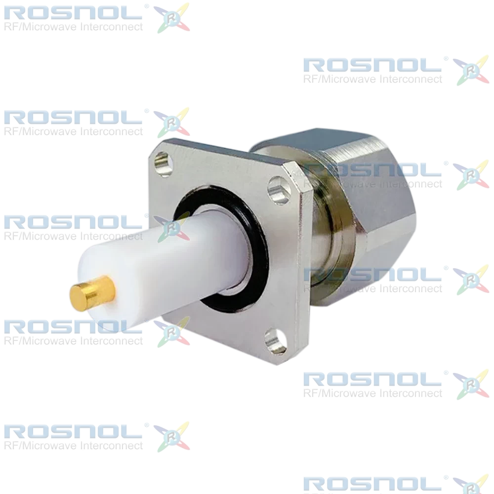 The ROSNOL 43101GFA50-5095A/144 is a high-performance 4.3-10 plug connector designed for panel receptacle mounting with a 4-hole flange and stub terminal configuration. It supports DC to 6 GHz with 50 Ω impedance, VSWR ≤ 1.20 (≥ 20.83 dB return loss), and insertion loss ≤ 0.1√f (GHz) dB. Electrical integrity includes insulation resistance ≥ 5 GΩ, RF leakage ≥ 110 dB up to 6 GHz for tool-tightened plugs, and power handling up to 500 W at 2 GHz. Mechanical reliability is ensured with screw-lock coupling, ≥ 500 mating cycles, and recommended torque of 5 Nm.Constructed for durability, the center contact is brass with 3 μinch gold plating over 80 μinch non-magnetic nickel-phosphorus underplating. The body and coupling nut are brass with copper-tin-zinc alloy finish, while the insulator is PTFE for superior dielectric performance. A silicone rubber gasket provides environmental sealing, ensuring IP68 compliance for moisture resistance.