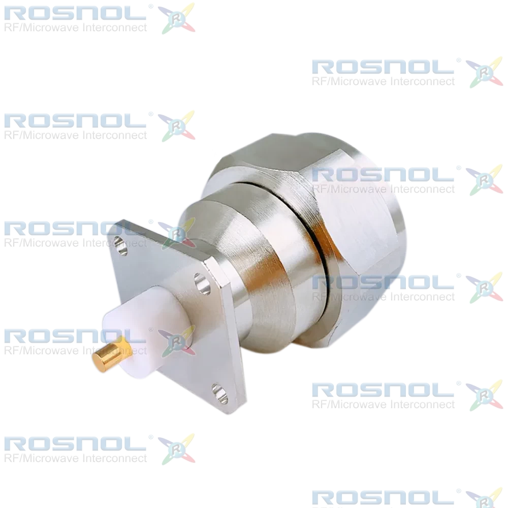 The ROSNOL 716-1GFA50-4975A/144 is a precision-engineered 7/16 plug connector designed for panel receptacle mounting in high-frequency RF systems. It supports DC to 7.5 GHz with 50 Ω impedance and delivers VSWR ≤ 1.20 for stable signal integrity. Electrical specifications include insulation resistance ≥ 5 GΩ, test voltage 2500 V rms, and working voltage up to 500 V rms. Mechanical reliability is ensured with screw-lock coupling and ≥ 500 mating cycles, making it ideal for demanding environments.Constructed for durability, the center contact is brass with 3 μinch gold plating over 80 μinch non-magnetic nickel-phosphorus underplating. The body and coupling nut are brass with copper-tin-zinc alloy finish, while the insulator is PTFE for superior dielectric performance. A silicone rubber gasket provides environmental sealing for robust operation.
