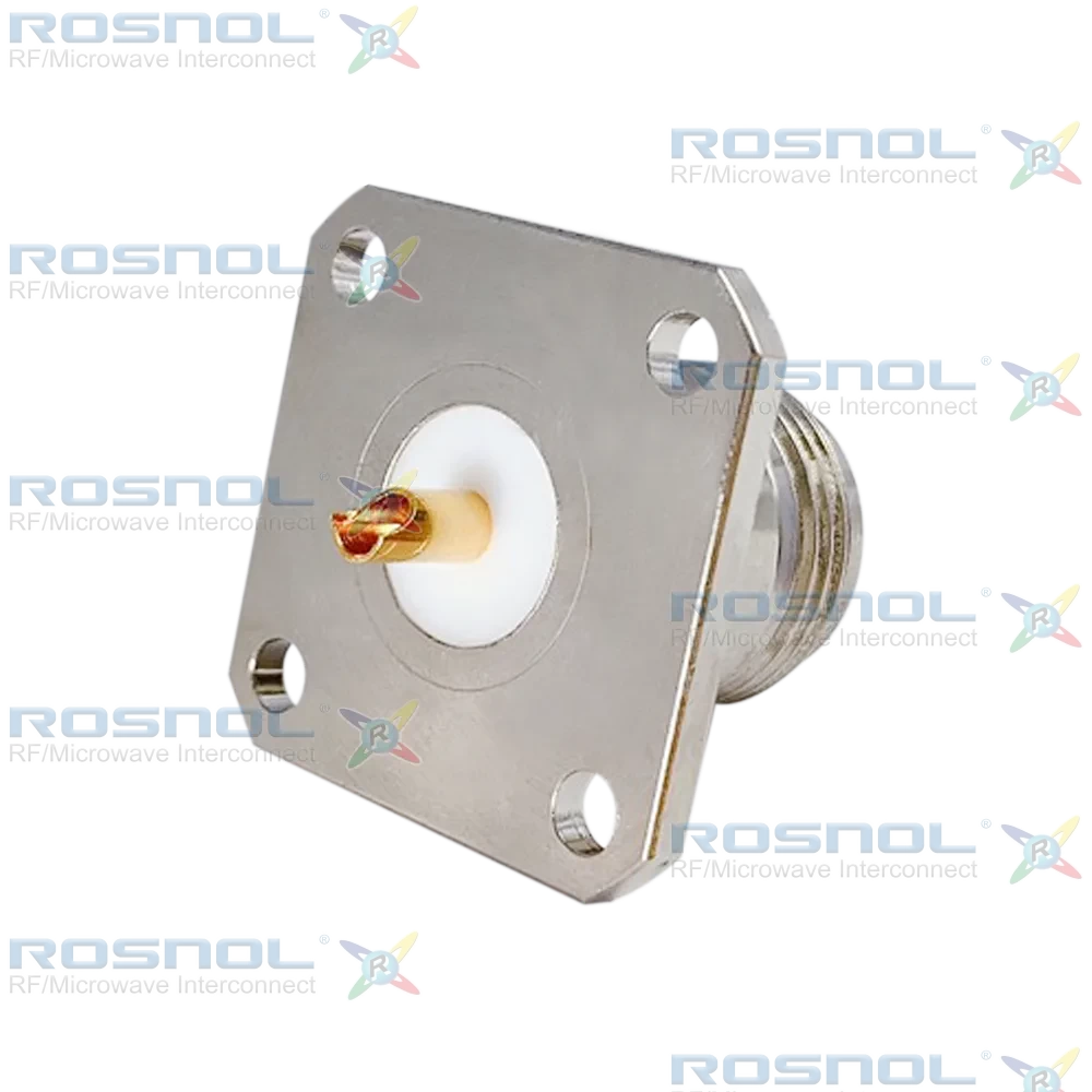 The ROSNOL N2GFB50-2500C/9Y is a high-quality connector designed for RF and microwave applications requiring secure solder attachment and flange mounting. It supports DC to 11 GHz with 50 Ω impedance, VSWR ≤ 1.20, insertion loss ≤ 0.1√f (GHz) dB, and RF leakage ≥ 85 dB up to 1 GHz. Electrical specifications include insulation resistance ≥ 5 GΩ and power handling up to 1000 W at 1 GHz. Mechanical integrity is ensured with screw-lock coupling, ≥ 500 mating cycles, and captivated solder cup terminal for enhanced durability.The center contact is beryllium copper with gold plating over nickel-phosphorus underplating, while the body is stainless steel with nickel finish. PTFE insulators provide superior dielectric properties, and silicone rubber gaskets ensure environmental sealing for IP-rated protection.