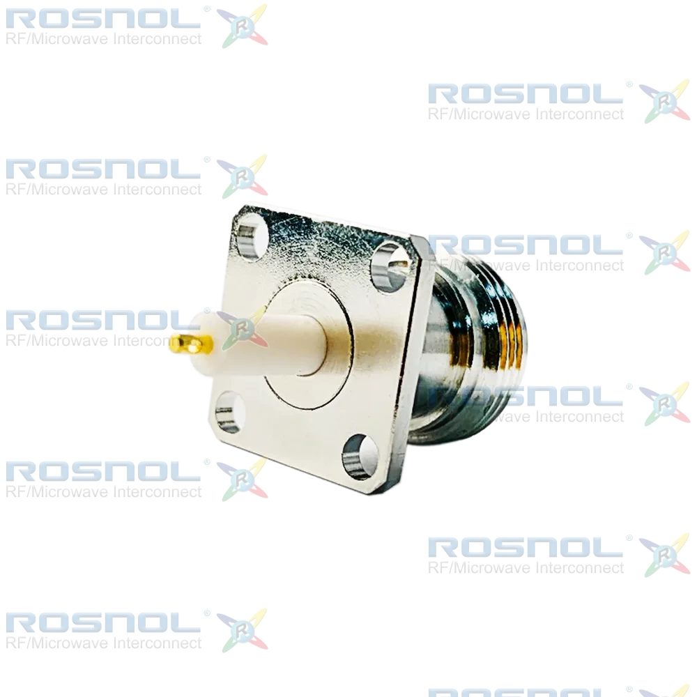 The ROSNOL N2GFE50-3036C-LP/94 is a high-performance N jack connector designed for RF systems requiring secure solder attachment and epoxy captivation. Featuring a 4-hole flange with 12.7 mm (0.500 inch) hole spacing, this connector supports DC to 5 GHz with 50 Ω impedance, VSWR ≤ 1.10, and insertion loss ≤ 0.05√f (GHz) dB. Electrical specifications include insulation resistance ≥ 5000 MΩ, center contact resistance ≤ 1 mΩ, and RF leakage ≥ -90 dB. Rated for 1000 V rms dielectric withstanding voltage and power handling up to 250 W average at 2 GHz, it ensures robust performance for high-power applications. PIM level is guaranteed at ≥ -150 dBc.The center contact is beryllium copper with gold plating per MIL-G-45204 specifications, while the body is brass with copper-tin-zinc alloy finish. PTFE insulators provide excellent dielectric properties. Mechanical features include screw-lock coupling, ≥ 500 mating cycles, epoxy-captivated solder cup terminal, and coupling nut torque of 8–10 lbs (0.90–1.13 N·m). Environmental compliance includes MIL-STD-202 tests for vibration, shock, thermal cycling, and salt atmosphere, ensuring reliability under harsh conditions.