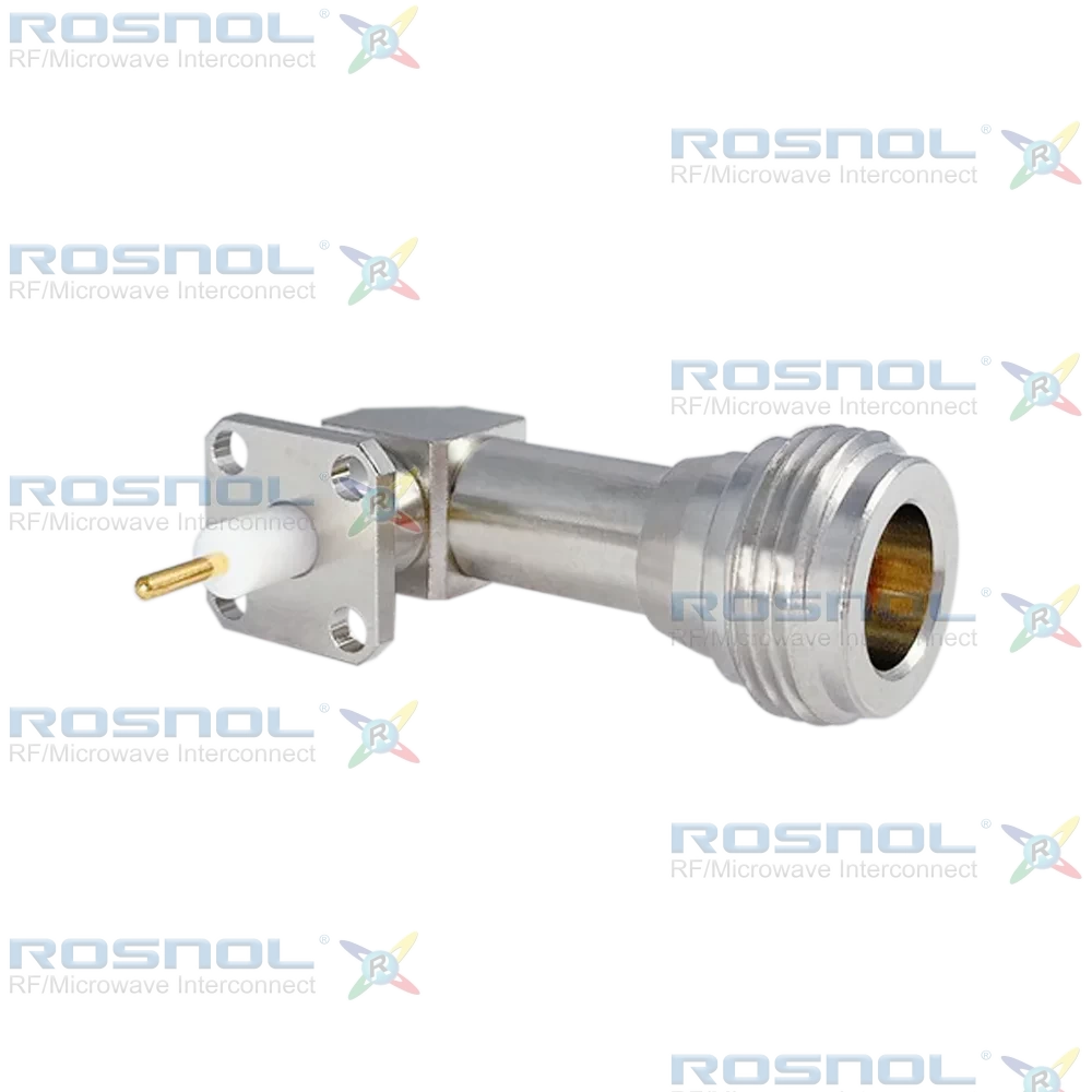 The ROSNOL N2GFE59-3298B/90-LP is a high-performance right-angle panel connector designed for RF and microwave applications requiring secure solder attachment and flange mounting. It operates from DC to 5 GHz with 50 Ω impedance, VSWR ≤ 1.12, and insertion loss ≤ 0.05√f (GHz) dB. Electrical specifications include insulation resistance ≥ 5 GΩ, RF leakage ≤ 128 dB up to 1 GHz, and power handling up to 1000 W at 1 GHz and 700 W at 2 GHz. Mechanical integrity is ensured with screw-lock coupling, ≥ 500 mating cycles, and captivated solder cup terminal for enhanced durability.The center contact is beryllium copper with gold plating (≥100 microinches per MIL-G-45204), while the body is brass with silver plating. PTFE insulators provide superior dielectric properties, and the connector withstands environmental conditions from -65°C to +165°C.