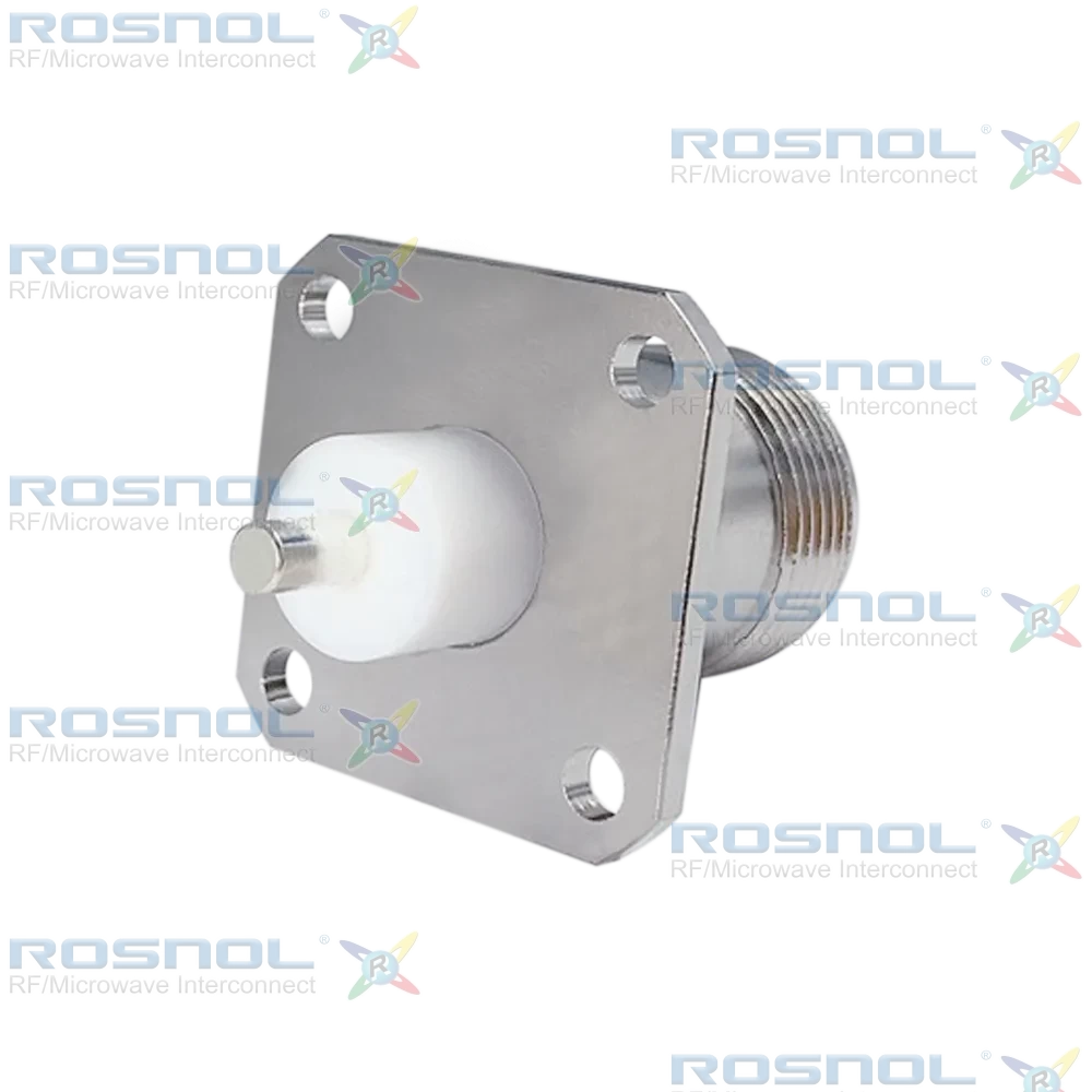 The ROSNOL SC2GFA50-3711A/84 is a straight panel receptacle jack engineered for high-frequency RF and microwave systems. It offers a 50 Ω impedance and supports frequencies from DC to 11 GHz, ensuring consistent signal integrity. The connector employs a screw-lock coupling mechanism for secure engagement and long-term reliability. Mechanical dimensions include a flange size of 37.11 mm \[1.461 in] and mounting holes of Ø3.2 mm \[.126 in], with a precise 4-hole configuration for stable panel installation. Operating temperature ranges from -65°C to +165°C, meeting stringent durability standards.The center contact is crafted from beryllium copper with silver plating for superior conductivity, while the body is made of brass finished with a copper-tin-zinc alloy for enhanced corrosion resistance. The insulator uses PTFE for excellent dielectric performance. Hole spacing for the flange mount is 25.4 mm \[1.000 in], ensuring compatibility with standard RF panel layouts and simplifying integration into existing systems. This robust construction guarantees mechanical strength and electrical reliability under demanding conditions.