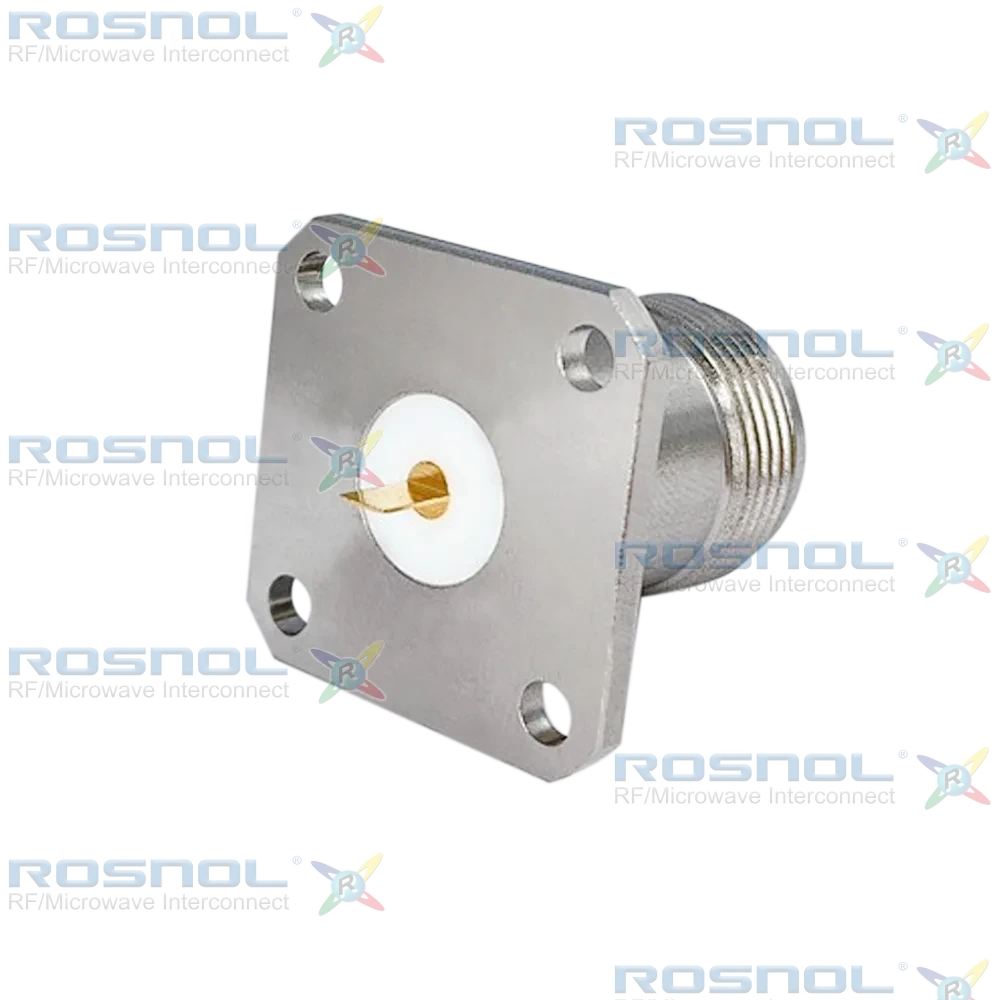 The ROSNOL SC2GFD50-2870A/9X is a straight panel receptacle jack engineered for high-frequency RF and microwave systems. It provides a 50 Ω impedance and supports a frequency range from DC to 11 GHz, ensuring stable signal integrity. The connector features a screw-lock coupling mechanism for secure engagement and long-term reliability. Key mechanical dimensions include an overall length of 28.7 mm \[1.130 in], flange diameter of 32 mm \[1.260 in], and mounting holes of Ø3.2 mm \[.126 in] arranged in a 4-hole configuration. The hole spacing between adjacent mounting holes is 18.24 mm \[.718 in], and the coupling thread size is 11/16-24 UNEF-2A. The connector operates within a temperature range of -65°C to +165°C, meeting stringent durability requirements.The center contact is made of beryllium copper with gold plating over a nickel underplate, delivering excellent conductivity and corrosion resistance. The body is constructed from stainless steel with passivated finish for superior strength and environmental protection, while the insulator is PTFE, offering outstanding dielectric performance. Additional dimensions include a flat end thickness of 5.08 mm \[.200 in], ensuring compatibility with standard RF panel layouts and simplifying integration into existing systems. This robust construction guarantees mechanical strength and electrical reliability under demanding conditions.