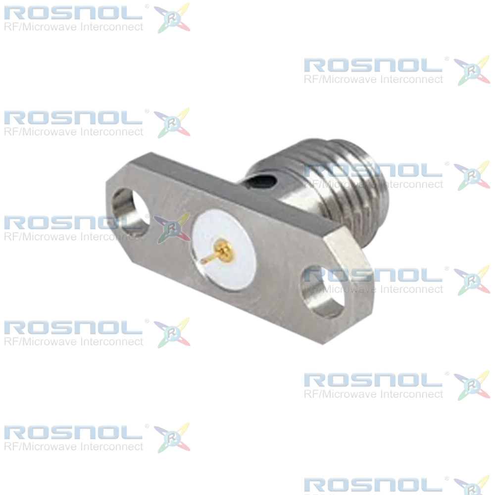 The ROSNOL SMA2GTA50-1100A_9X is a 50 Ω RF connector featuring a 2-hole flange mount with 12.22mm (.481 inch) hole spacing. Designed with a Screw-lock coupling mechanism, it ensures secure mating and reliable performance up to 18 GHz. The center contact is Soldered, and the terminal type is Stub, offering excellent signal integrity. This connector utilizes Mechanical center contact captivation, with axial retention ≥ 27 N and radial retention ≥ 3 Ncm.Constructed with a Stainless Steel, Passivated body and a Beryllium Copper, Gold plating 3 µinch over 80 µinch non-magnetic nickel-phosphorus center contact, the connector includes a PTFE insulator, ensuring stable dielectric performance across a wide temperature range.