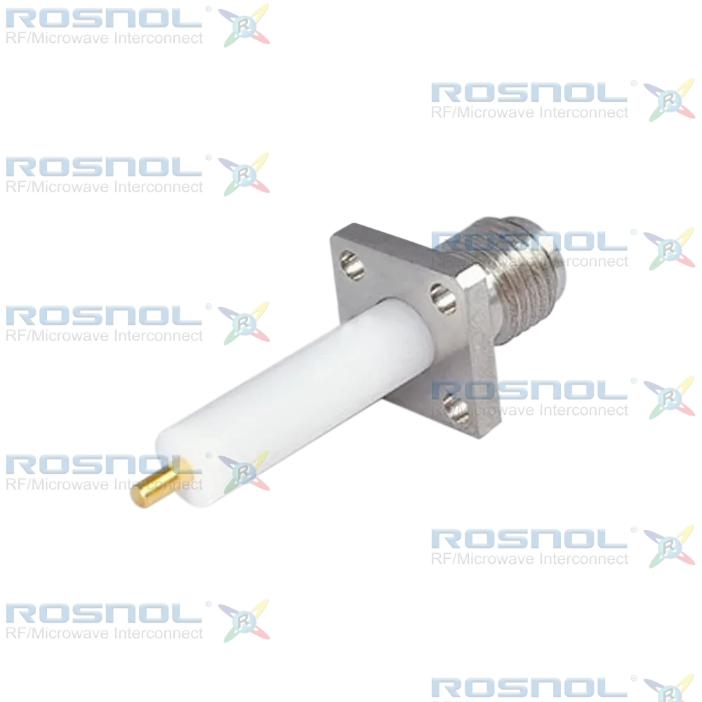The ROSNOL SMA2GFA50-2740B/9X is a high-performance RF connector designed for secure panel mounting in microwave systems. It offers 50 Ω impedance and operates from DC to 18 GHz with VSWR ≤ 1.30, ensuring stable signal integrity. The screw-lock coupling mechanism supports ≥500 mating cycles for long-term reliability. Key dimensions include an overall length of 27.4 mm \[1.079 in], flange size of 15 mm \[.591 in], mounting holes of Ø1.7 mm \[.067 in], and hole spacing of 6.35 mm \[.250 in]. The thread specification is 1/4-36 UNS, and the connector withstands temperatures from -65°C to +165°C.The center contact is beryllium copper with gold plating over a nickel-phosphorus underplate for superior conductivity, while the body is stainless steel with passivated finish for corrosion resistance. The insulator is PTFE, providing excellent dielectric properties. The soldered stub terminal ensures secure electrical connection and mechanical stability under high-frequency conditions.