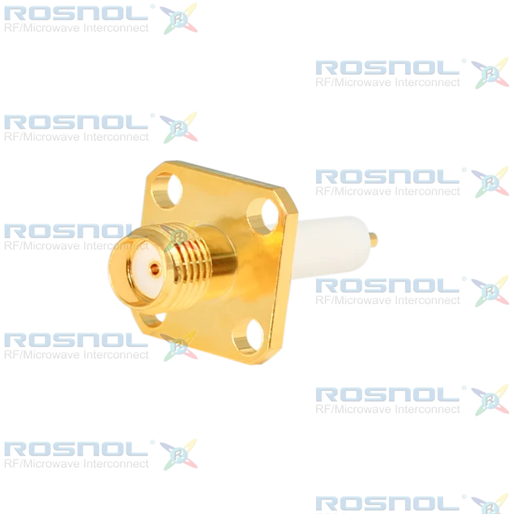 The ROSNOL SMA2GFA50-2740A/9Q is a precision RF connector for panel-mounted systems requiring high-frequency stability. It provides 50 Ω impedance and operates from DC to 18 GHz with VSWR ≤ 1.30 for consistent signal performance. The screw-lock coupling ensures secure mating and durability with ≥500 cycles. Key dimensions include an overall length of 27.4 mm \[1.079 in], flange size of 15 mm \[.591 in], mounting holes of Ø2.6 mm \[.102 in], and hole spacing of 8.64 mm \[.340 in]. The thread specification is 1/4-36 UNS, and the connector withstands temperatures from -65°C to +165°C.The center contact is beryllium copper with gold plating over a nickel-phosphorus underplate, while the body is stainless steel with the same plating for enhanced corrosion resistance. The insulator is PTFE, ensuring excellent dielectric strength. The soldered stub terminal design provides secure electrical connection and mechanical integrity for high-frequency applications.