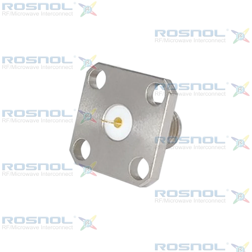 The ROSNOL SMA2GFD50-1204A/9X is designed for high-frequency RF systems requiring robust panel mounting. It offers 50 Ω impedance and operates from DC to 18 GHz with VSWR ≤ 1.30, delivering reliable signal integrity. The screw-lock coupling mechanism supports ≥500 mating cycles for long-term durability. Key dimensions include an overall length of 12.04 mm \[.474 in], flange size of 12.7 mm \[.500 in], mounting holes of Ø2.6 mm \[.102 in], and hole spacing of 8.64 mm \[.340 in]. The thread specification is 1/4-36 UNS, and the connector operates in temperatures from -65°C to +165°C.The center contact is beryllium copper with gold plating over a nickel-phosphorus underplate, while the body is stainless steel with passivated finish for corrosion resistance. The insulator is PTFE, providing excellent dielectric performance. The flat terminal ensures secure electrical connection and mechanical stability under high-frequency conditions.