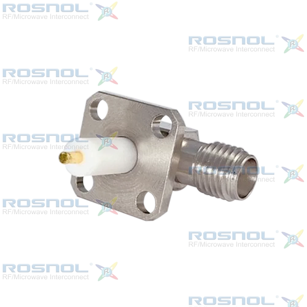 The ROSNOL SMA2GFA59-2340A/9X is a right-angle panel receptacle jack designed for high-frequency RF and microwave systems. It provides 50 Ω impedance and operates from DC to 18 GHz with VSWR ≤ 1.30, ensuring stable signal integrity. The screw-lock coupling mechanism supports ≥500 mating cycles for long-term reliability. Key dimensions include an overall length of 23.4 mm \[.921 in], flange size of 12.7 mm \[.500 in], mounting holes of Ø2.6 mm \[.102 in], and hole spacing of 8.64 mm \[.340 in]. The thread specification is 1/4-36 UNS, and the connector withstands temperatures from -65°C to +165°C.The center contact is beryllium copper with gold plating over a nickel-phosphorus underplate for superior conductivity, while the body is stainless steel with passivated finish for corrosion resistance. The insulator is PTFE, providing excellent dielectric properties. The soldered stub terminal ensures secure electrical connection and mechanical stability under high-frequency conditions.