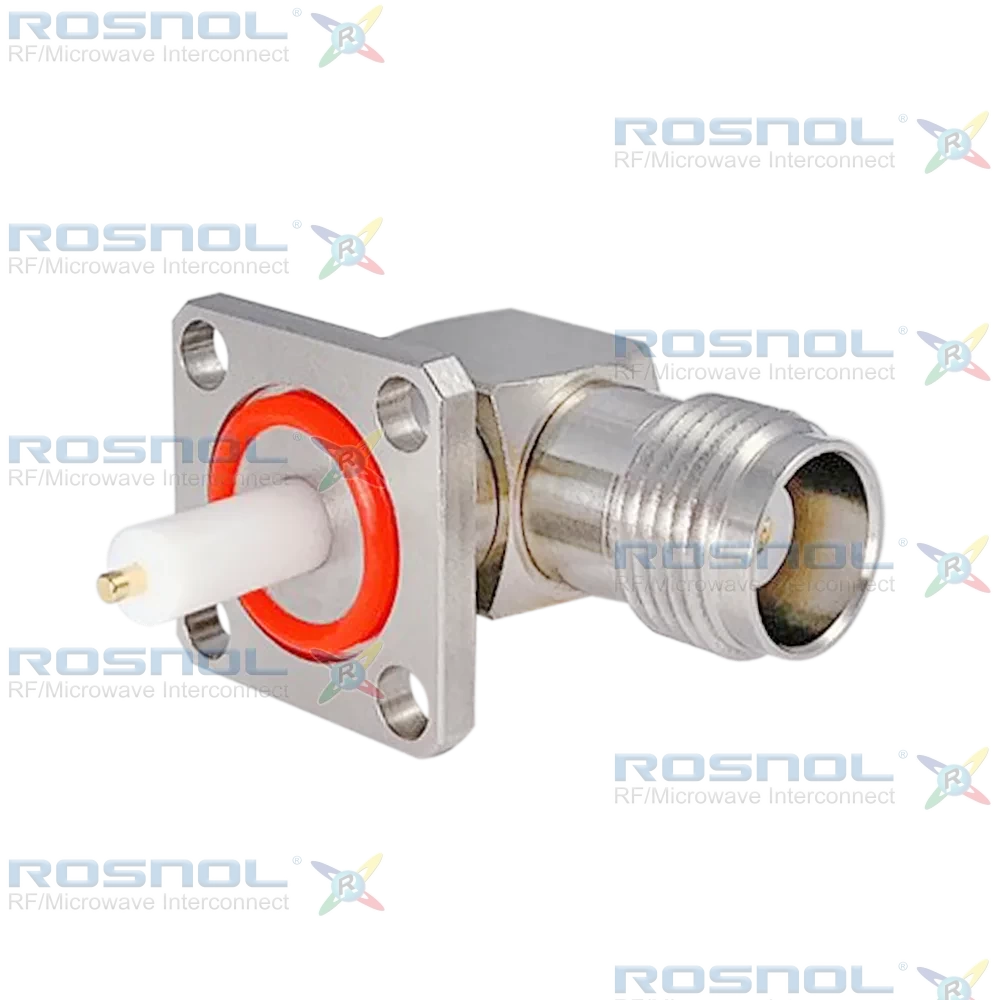 The ROSNOL TNC2GFA50-2940A/HX is a high-performance RF connector designed for secure panel mounting in microwave systems. It offers 50 Ω impedance and operates from DC to 4 GHz with VSWR ≤ 1.09, ensuring excellent signal integrity. The screw-lock coupling mechanism supports ≥500 mating cycles for long-term reliability. Key dimensions include an overall length of 29.4 mm \[1.157 in], flange size of 17.5 mm \[.689 in], mounting holes of Ø3.2 mm \[.126 in], and hole spacing of 12.7 mm \[.500 in]. The thread specification is 7/16-28 UNEF, and the connector withstands temperatures from -65°C to +165°C.The center contact is phosphor bronze with gold plating over a nickel-phosphorus underplate for superior conductivity, while the body is stainless steel with passivated finish for corrosion resistance. The insulator is PTFE, and a silicone rubber gasket ensures environmental sealing. The soldered stub terminal guarantees secure electrical connection and mechanical stability under high-frequency conditions.