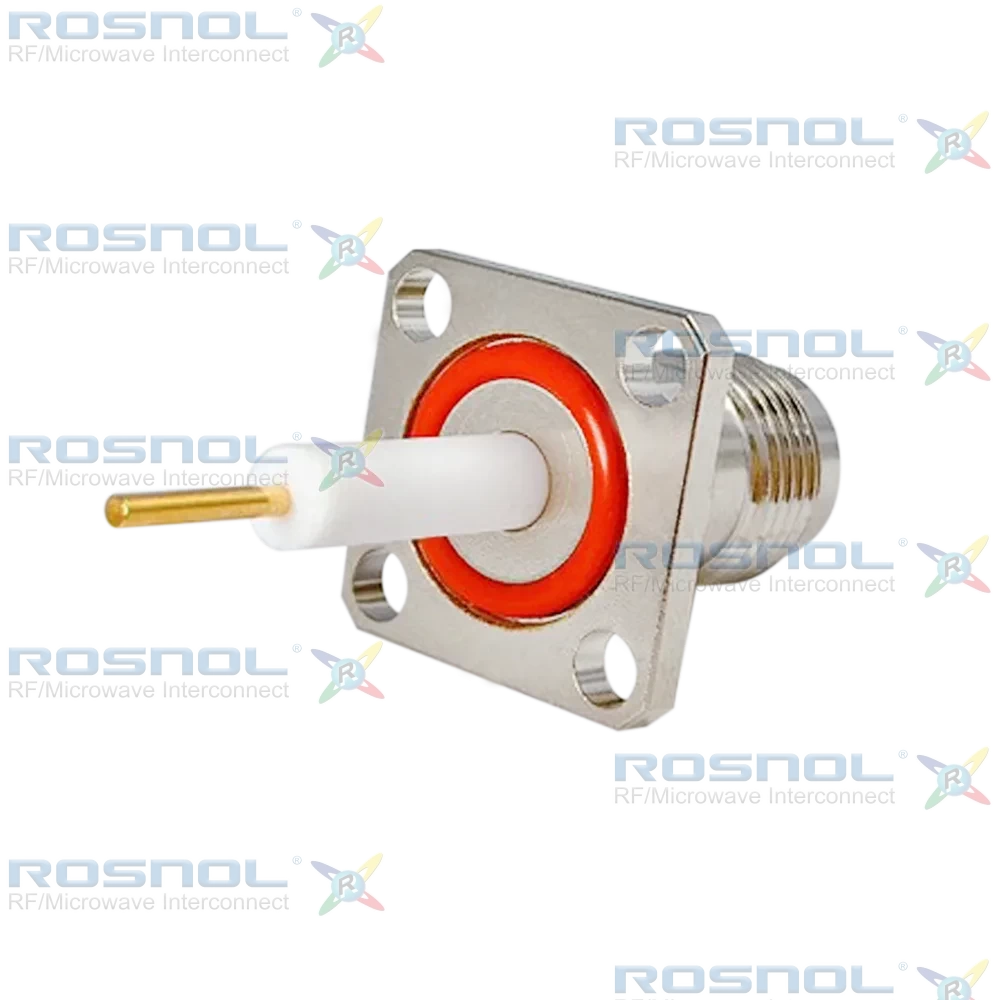 The ROSNOL TNC2GFA50-4080A/H3 is designed for high-frequency RF systems requiring robust panel mounting. It offers 50 Ω impedance and operates from DC to 4 GHz with VSWR ≤ 1.09, delivering reliable signal integrity. The screw-lock coupling mechanism supports ≥500 mating cycles for long-term durability. Key dimensions include an overall length of 40.8 mm \[1.606 in], flange size of 17.5 mm \[.689 in], mounting holes of Ø3.2 mm \[.126 in], and hole spacing of 12.7 mm \[.500 in]. The thread specification is 7/16-28 UNEF, and the connector operates in temperatures from -65°C to +165°C.The center contact is phosphor bronze with gold plating over a nickel-phosphorus underplate, while the body is brass with nickel plating for corrosion resistance. The insulator is PTFE, and a silicone rubber gasket provides environmental sealing. The soldered stub terminal ensures secure electrical connection and mechanical stability under high-frequency conditions.