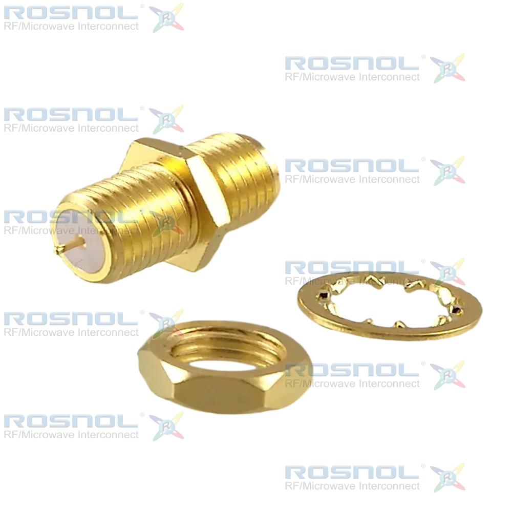 The ROSNOL SMA2FA50-1550A/91 is a straight bulkhead receptacle jack with solder attachment and stub terminal. Designed with a screw-lock coupling mechanism, it supports up to 18 GHz at 50 Ω impedance, delivering low VSWR and minimal insertion loss for high-frequency RF applications.Constructed with a Brass body and Beryllium Copper center contact, the connector features Gold plating over Nickel for optimal conductivity and corrosion resistance. The PTFE insulator ensures stable dielectric performance across a wide temperature range.