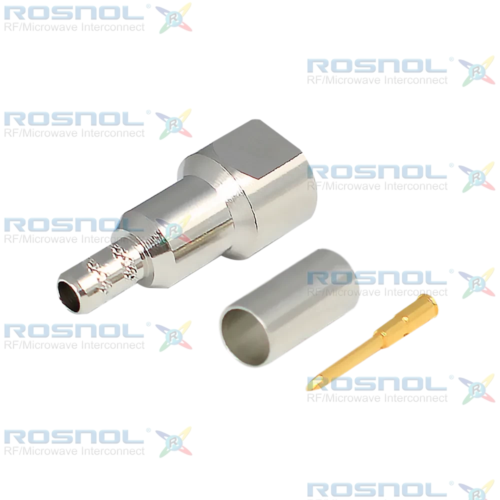 The ROSNOL FME1C50-G058A/13 is a 50 Ω RF Plug (Male) connector designed for screw-lock coupling and crimped cable termination. It supports frequencies from DC to 2.5 GHz and is compatible with RG58, RG141, RG303, BELDEN 7806A, and LMR 195 cables. The center contact can be soldered or crimped, and the connector is rated for operation from −65°C to +165°C.The connector body and crimp ferrule are machined from brass and plated with nickel for corrosion resistance. The center contact is brass with gold plating over a nickel underlayer. The insulator is made of PTFE, ensuring excellent dielectric stability. Crimp dimensions are 5.41 mm for the ferrule and 1.73 mm for the center contact.