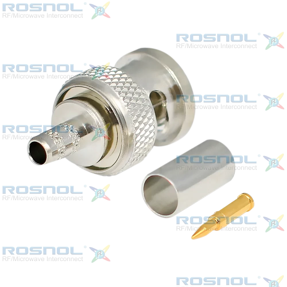 The ROSNOL BNC1C50-G142A/133 is a straight BNC plug (male) connector designed for RG142 and compatible coaxial cables such as RG55, RG223, and RG400. Operating from DC to 4 GHz with a 50 Ohm impedance and VSWR ≤ 1.22, this bayonet-lock connector ensures low insertion loss ≤ 0.05 dB and stable RF signal transmission, making it ideal for telecom, broadcast, and instrumentation applications.This model features a brass body and coupling nut plated with nickel. The center contact is made of brass with gold plating over nickel underplating, ensuring excellent conductivity and corrosion resistance. It includes a PTFE insulator and silicone rubber gasket, and supports soldered or crimped center contact with crimped cable entry. Designed for wide temperature ranges and over 500 mating cycles, it delivers consistent performance in demanding environments.