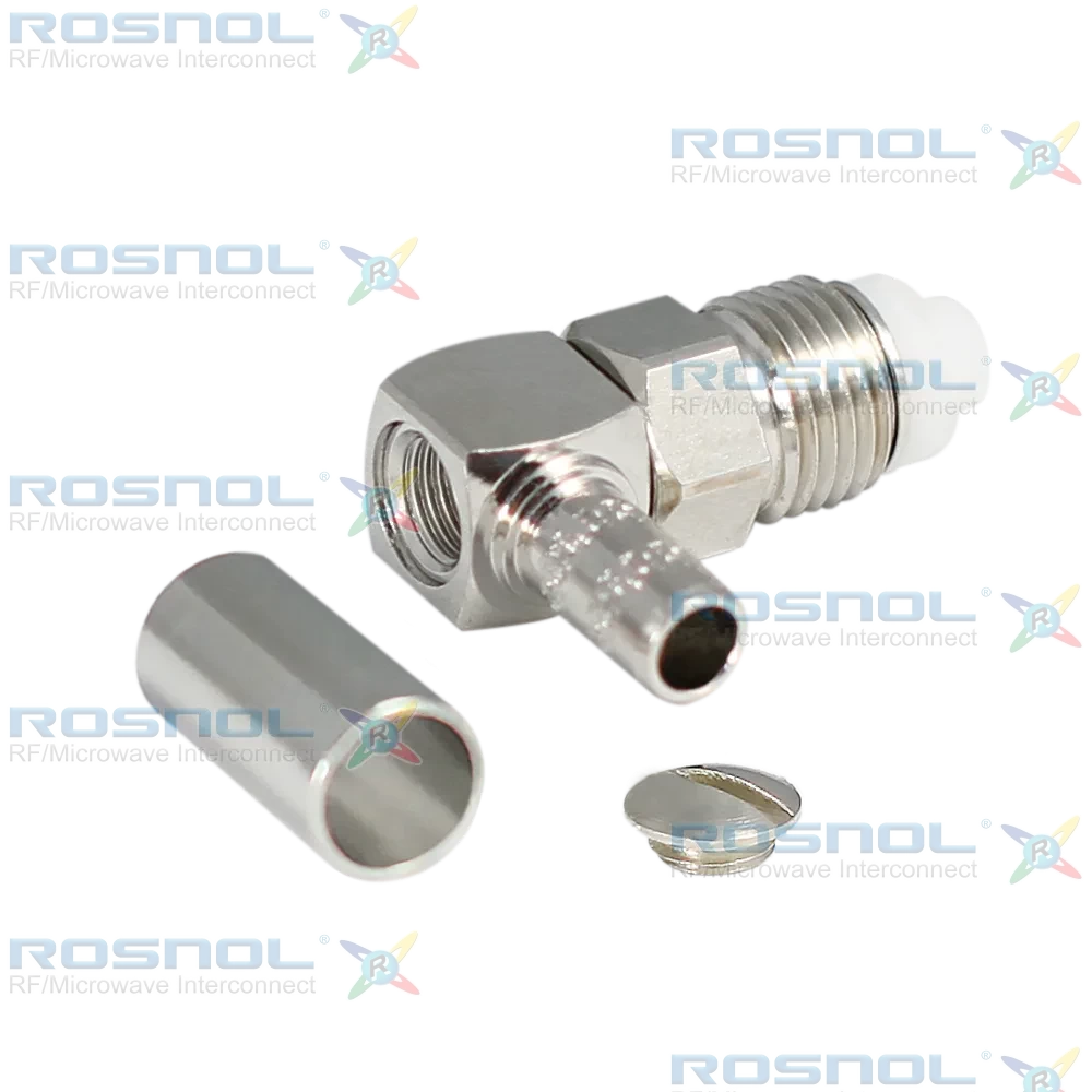 The ROSNOL FME2C59-G142A/H3 is a right-angle cable jack (female) RF connector designed for 50-ohm systems operating from DC to 2.5 GHz. It features a screw-lock coupling mechanism and a soldered center contact configuration. The crimped cable entry ensures secure mechanical retention and consistent signal transmission across RG55, RG142, RG223, and RG400 coaxial cables.This connector is constructed with a brass body and crimp ferrules, all plated in nickel for enhanced durability and corrosion resistance. The center contact is made of phosphor bronze with gold plating over a nickel underlayer, while the insulator is PTFE for excellent dielectric stability. Recommended crimp dimensions include 5.41 mm [.213 inch] HEX for the ferrule.