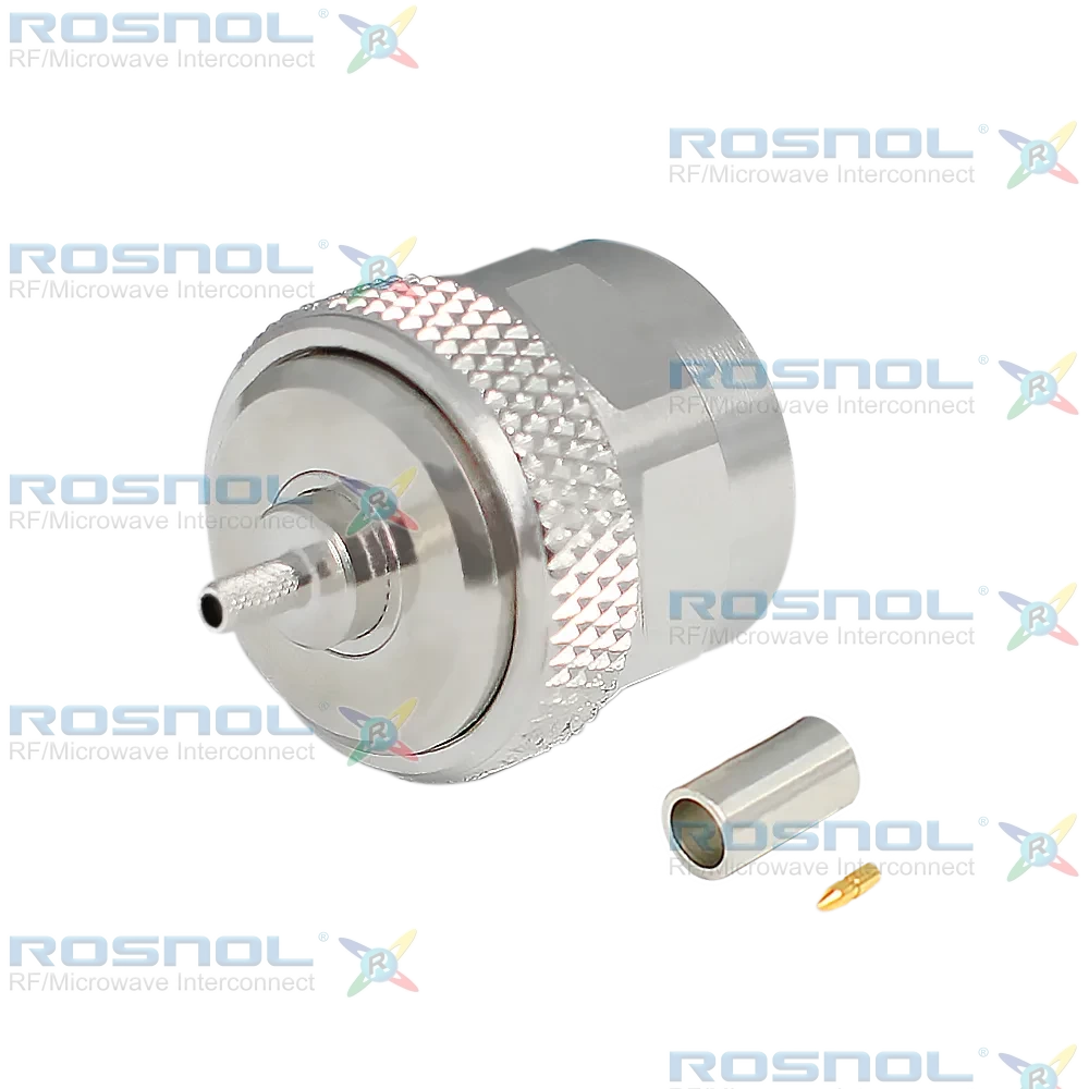The ROSNOL N1C50-G316A/144 is a straight N-type plug connector designed for 50 Ω impedance systems, supporting frequencies from DC to 6 GHz with a maximum VSWR of 1.20 (≥ 20.8 dB return loss). It features a screw-lock coupling mechanism and a crimped cable entry, with the center contact available in soldered or crimped configurations. This connector is compatible with RG 174, RG 188A, RG 316, and BELDEN 7805 cables.The connector body, coupling nut, and crimp ferrules are made of brass with Copper-Tin-Zinc alloy plating, while the center contact is brass with gold plating over a nickel underlayer. The insulator is PTFE, and the gasket is made of silicone rubber. This model ensures robust mechanical and electrical performance for high-frequency applications.