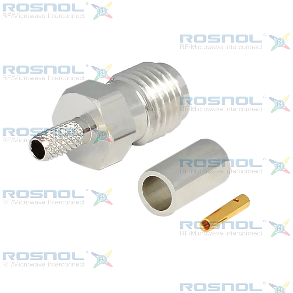 The ROSNOL SMA2C50-G316A/94 is a straight cable jack optimized for RF applications up to 6 GHz. It features a screw-lock coupling mechanism and a soldered or crimped centre contact, with a crimped cable entry suitable for RG 174, RG 188A, RG 316, and BELDEN-7805 cables.The connector body and crimp ferrules are made of brass with copper-tin-zinc alloy plating. The centre contact is gold-plated beryllium copper (nickel underplated), and the insulator is PTFE, offering high reliability and thermal stability.