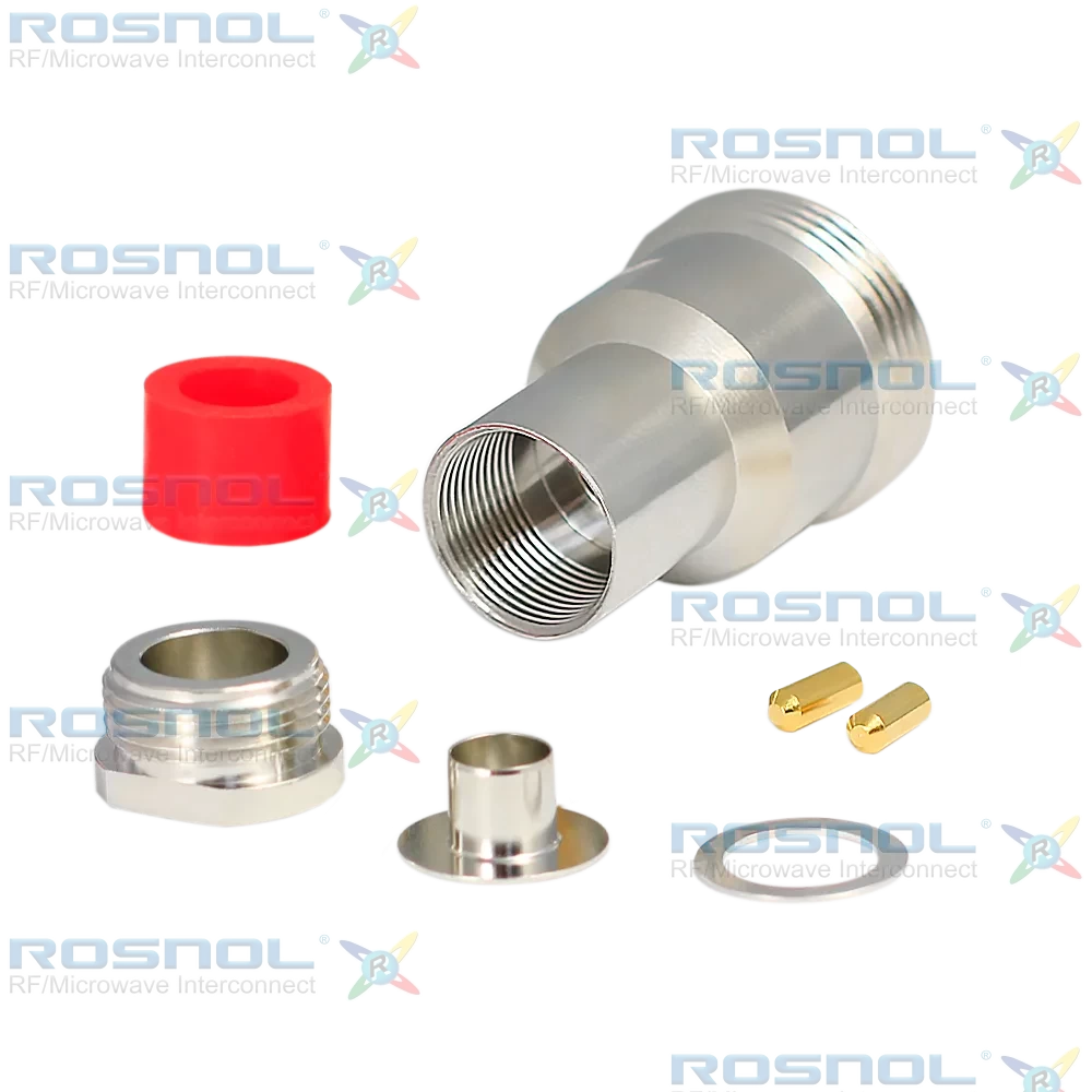The ROSNOL 716-2D50-R400A/H4 is a 7/16 Jack (Female) RF connector designed for clamped cable entry and screw-lock coupling. Operating at 50 Ω impedance and supporting frequencies from DC to 6 GHz, it ensures stable signal transmission with a maximum VSWR of 1.30. The connector features a soldered center contact and is compatible with LMR 400, RNL-400, RG-213, and RG-214 cables, making it ideal for high-frequency and high-power RF systems.This connector is built with a brass body and clamp nut, both plated with Copper-Tin-Zinc alloy for enhanced mechanical strength and corrosion resistance. The center contact is made of phosphor bronze with gold plating over a nickel underplating, ensuring excellent conductivity and long-term durability. The insulator is PTFE, and the gasket is made of silicone rubber, providing robust insulation and environmental sealing.